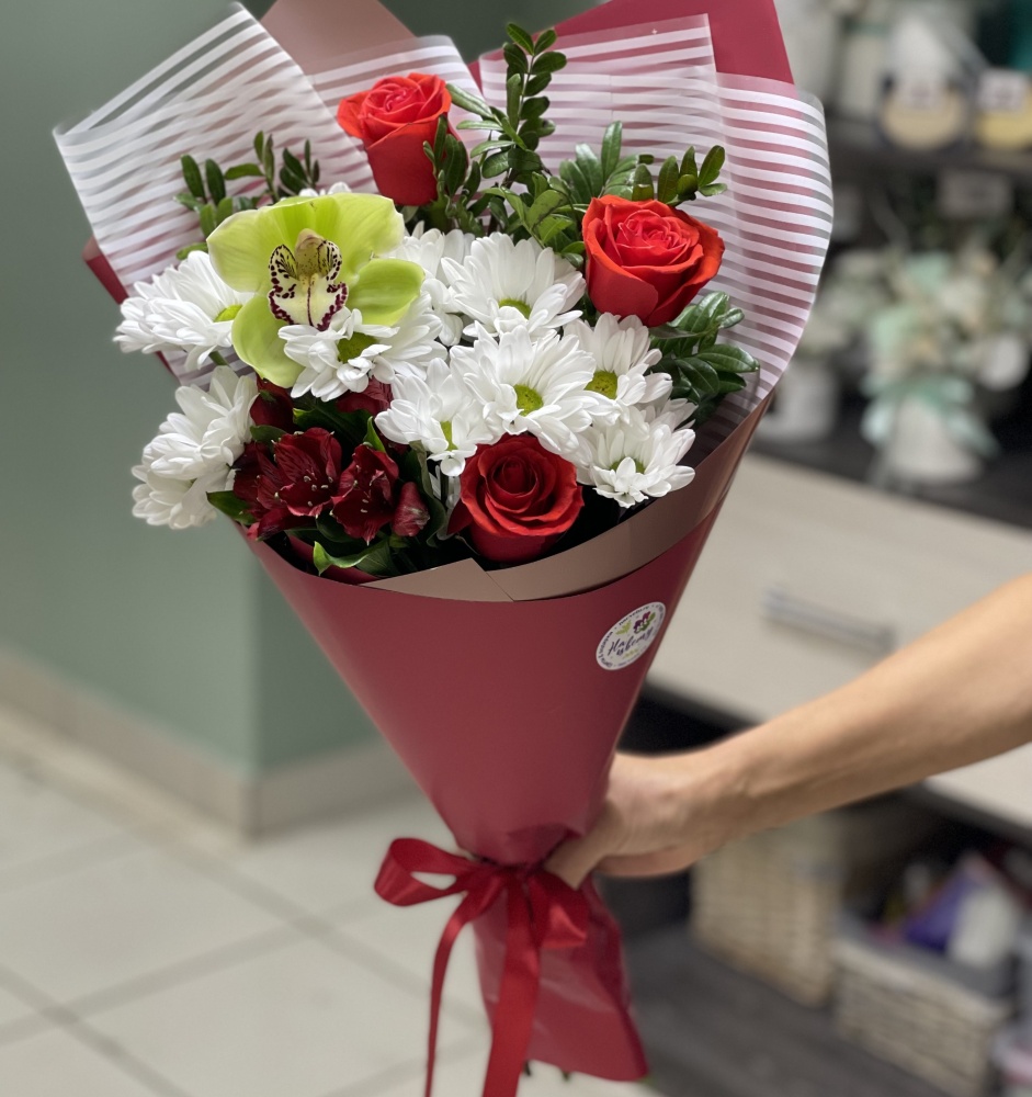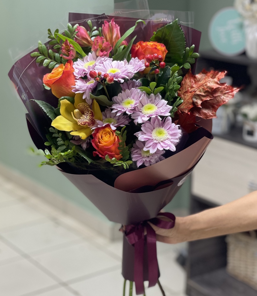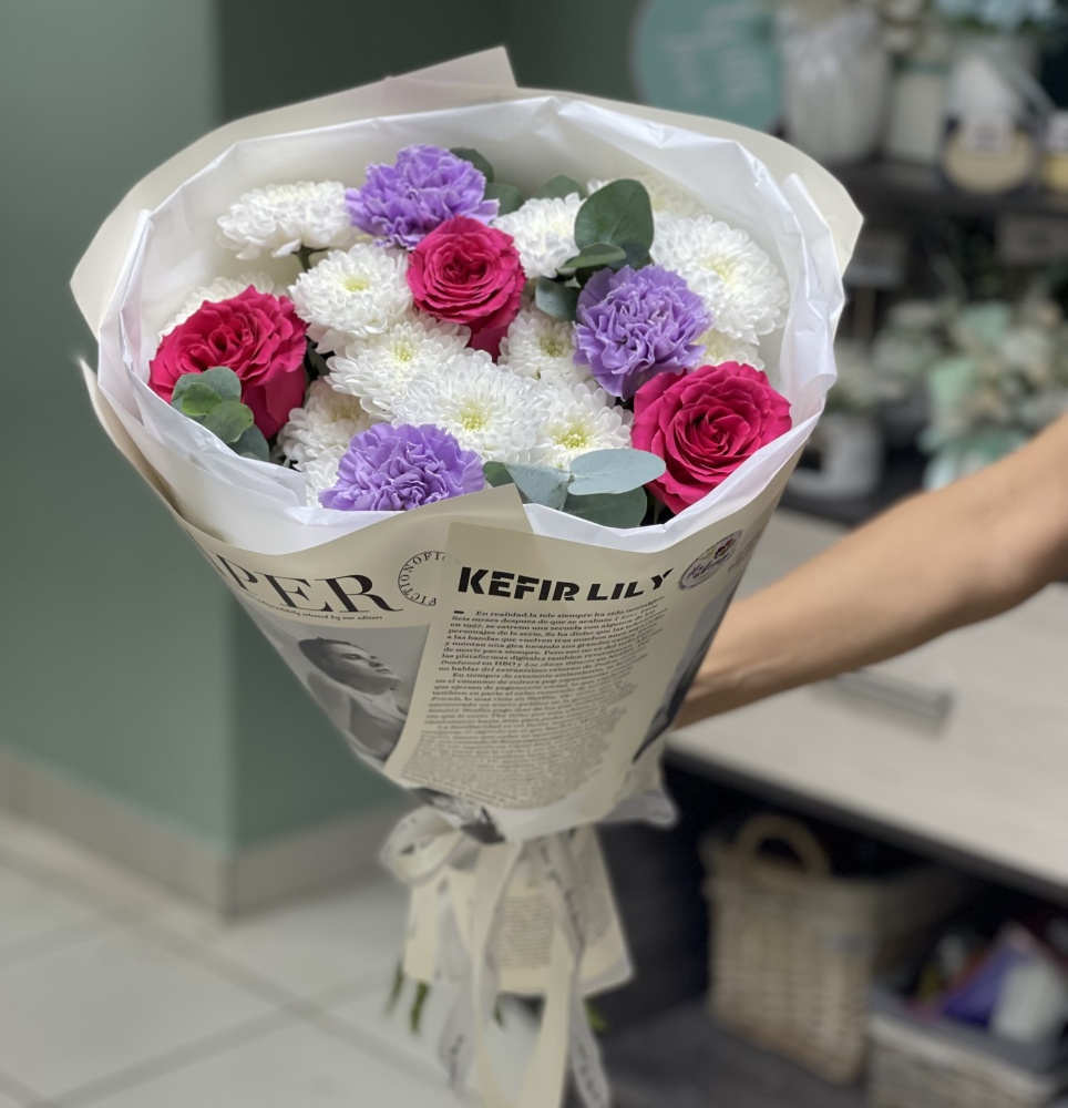 роза Эквадорская — 3шт, диантус -5 шт, хризантема кустовая — 3шт, танацетум, эвкалипт, упаковка, лента