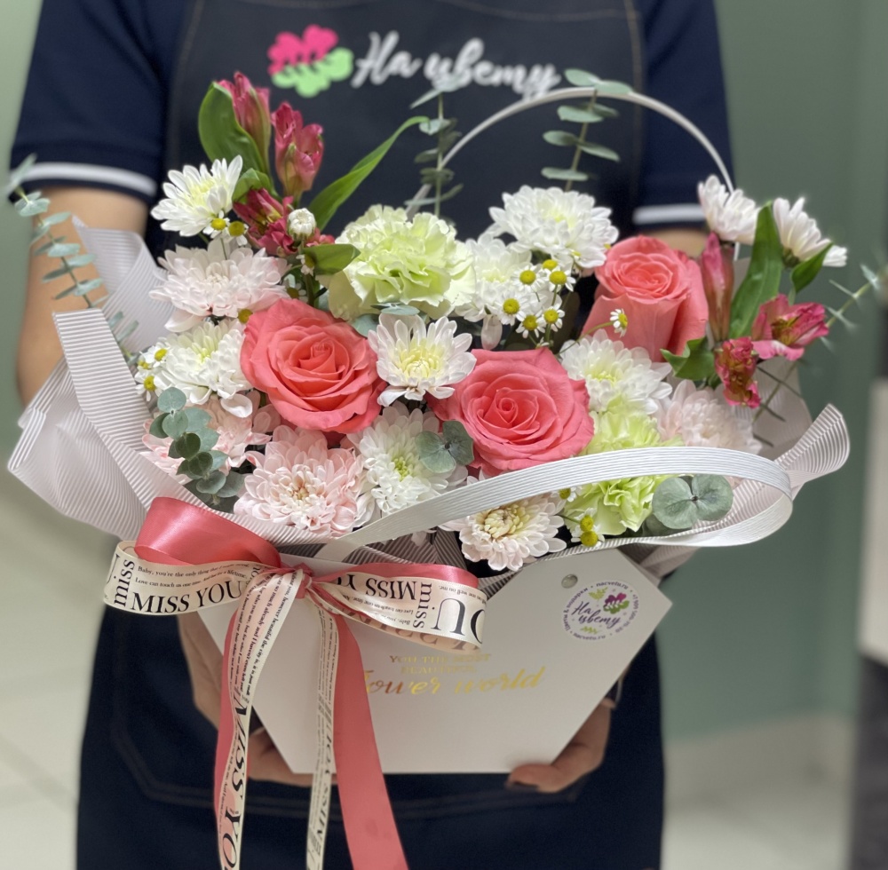 Хризантема кустовая — 4шт, Эквадорская роза 50см — 5шт, зелень, оазис, корзина 25-30см
