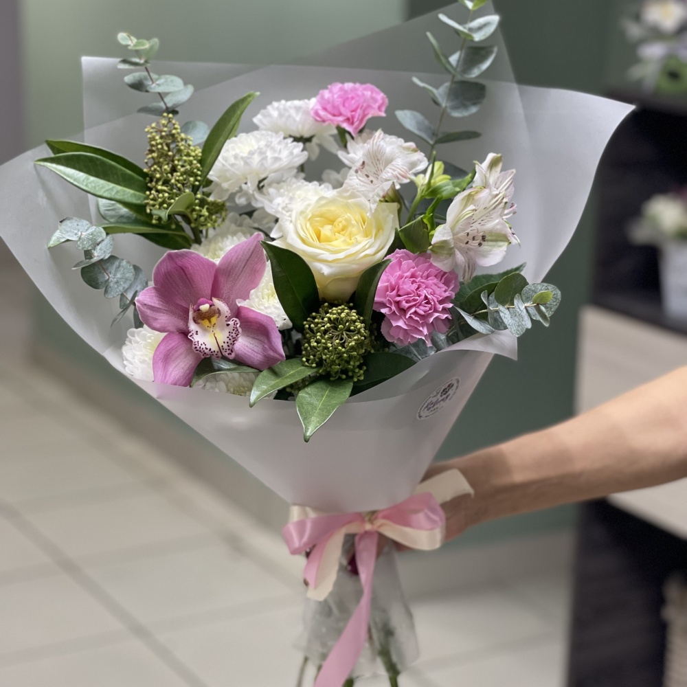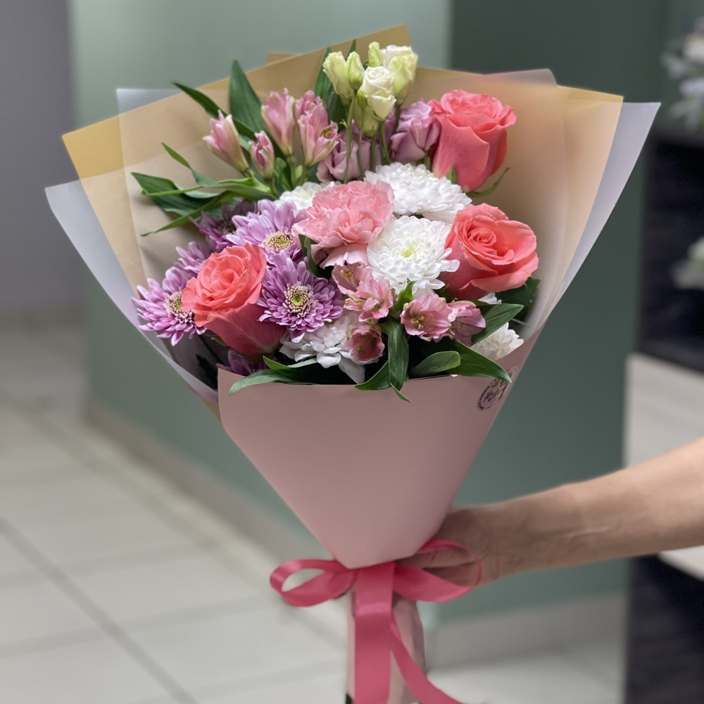 Хризантема кустовая 1шт, хризантема «Ньютон»-1шт, роза Эквадор -3шт, альстромерия -2шт, эустома -1шт, упаковка, лента