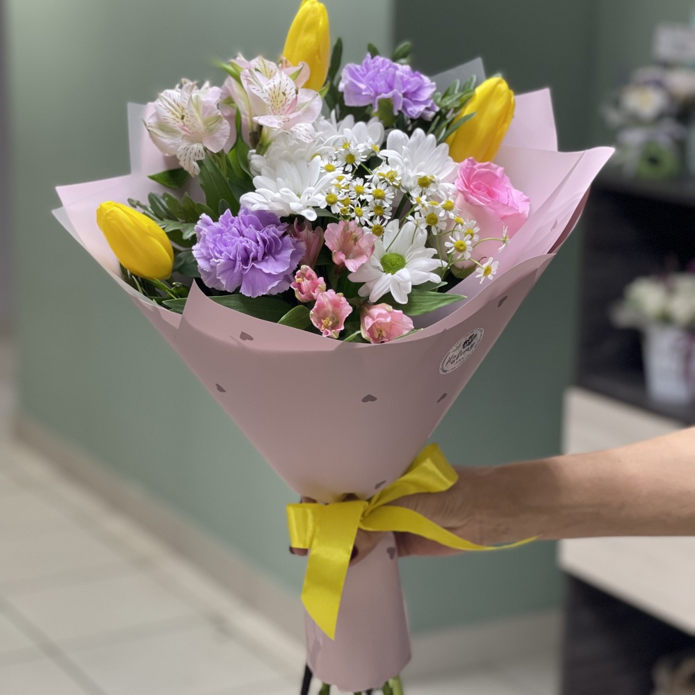 хризантема кустовая 3шт, альстромерия 2шт, диантус 3шт, тишью, упаковка, лента