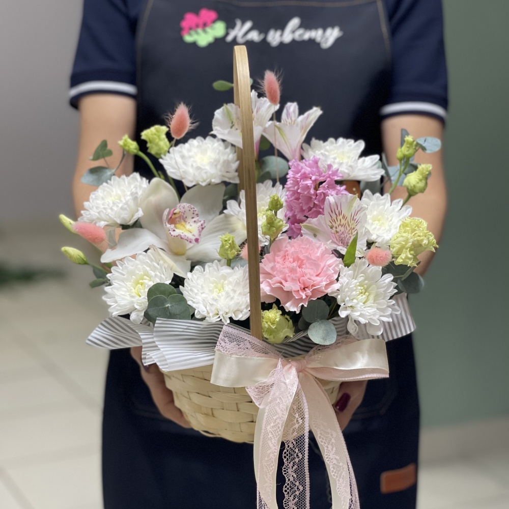Роза Эквадорская 50см — 11шт, хризантема кустовая — 6шт, фисташка, декор, оазис, корзина 35см