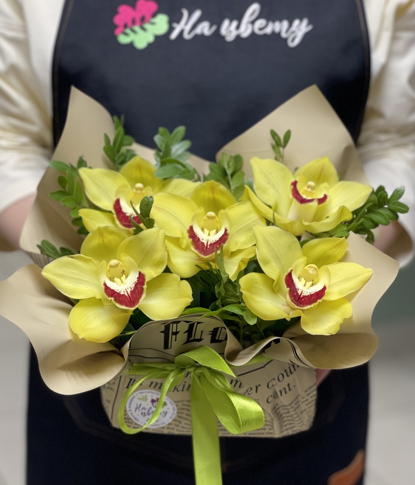 Орхидея цимбидиум -5 шт, писташ, оазис, крафт, лента.