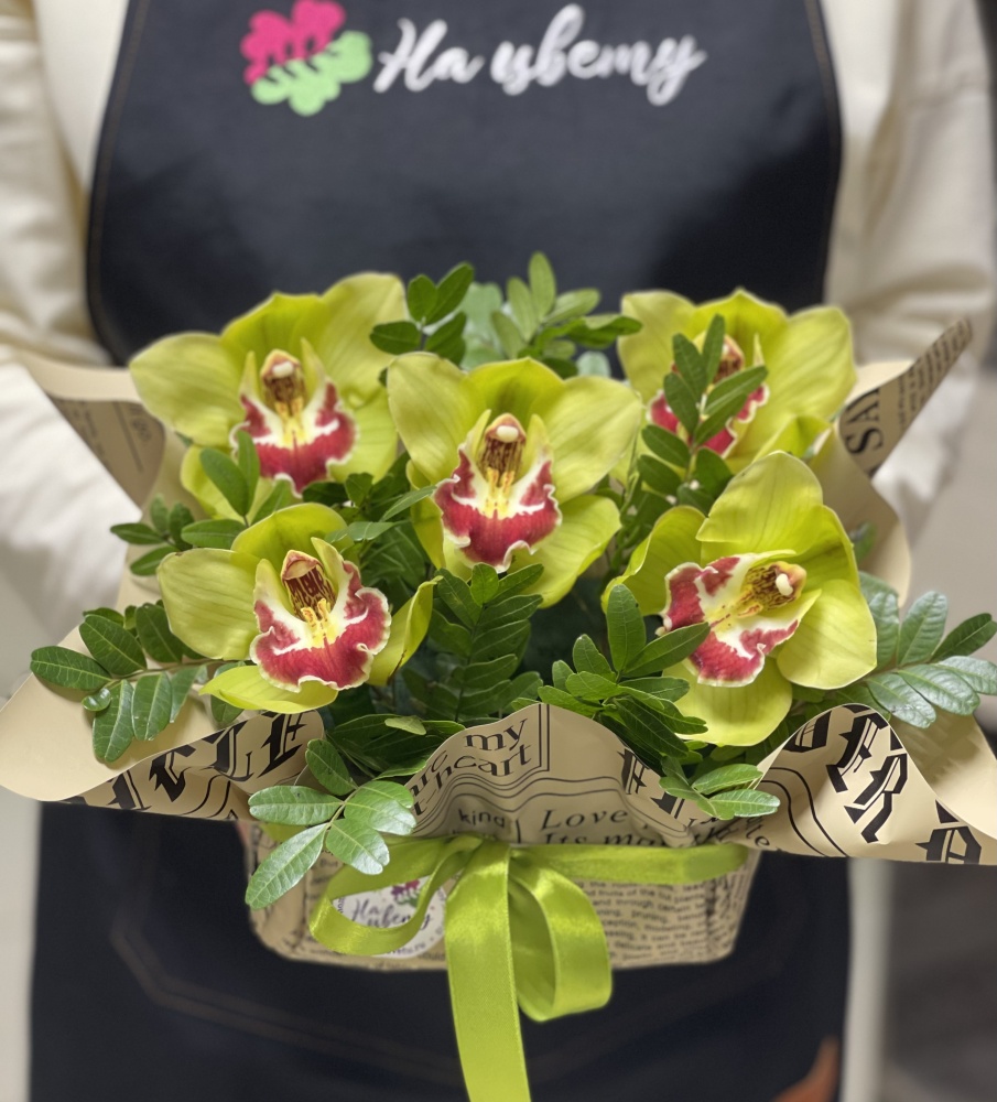 орхидея цимбидиум -5 шт, писташ, оазис, крафт, лента.