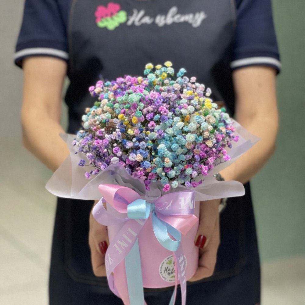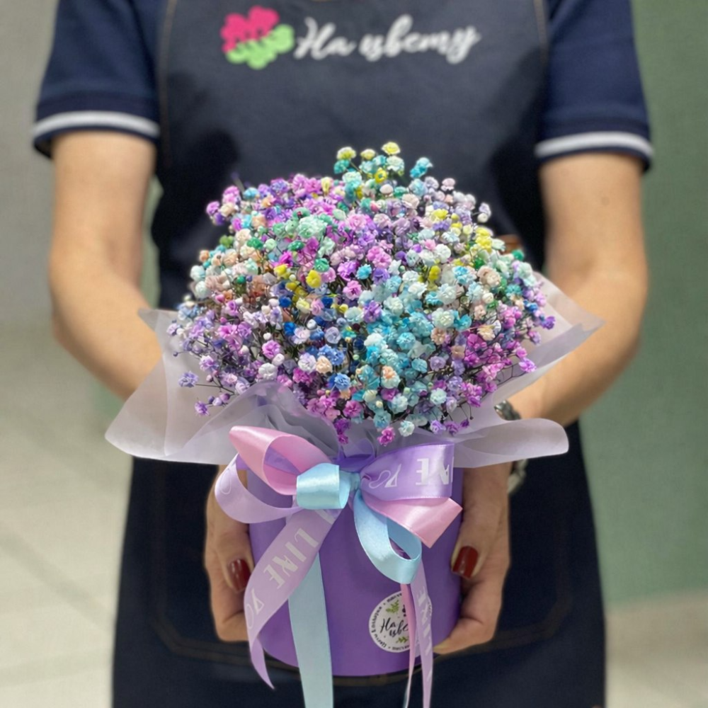 Гипсофила радужная 3шт, оазис, шляпная коробка 12см, лента.