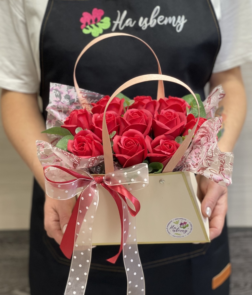 Мыльные розы — 11шт, декоративная зелень, оазис, сумочка, лента. Размеры композиции: 21см10см22см