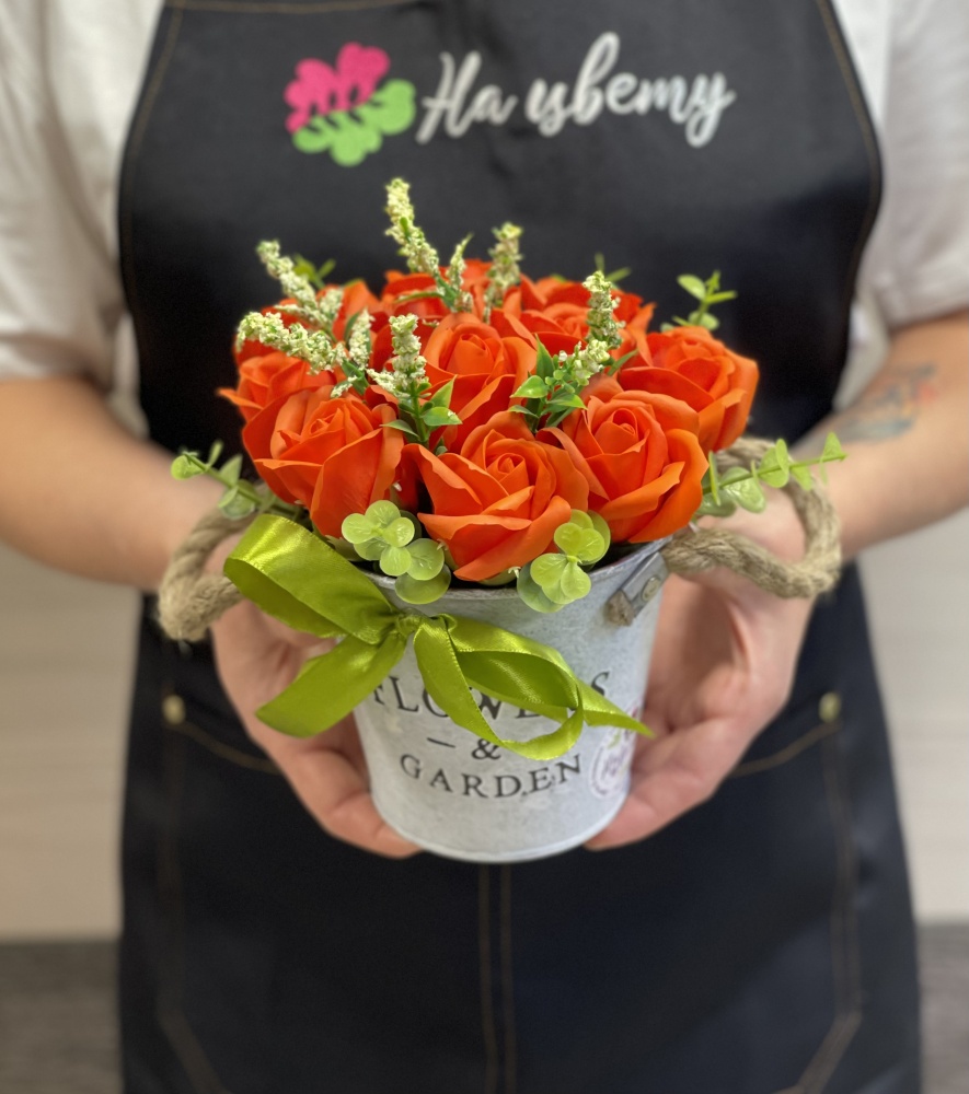 Мыльные розы — 11шт, оазис, ведерко «Flowers & Garden», лента. Размеры композиции: 20см20см