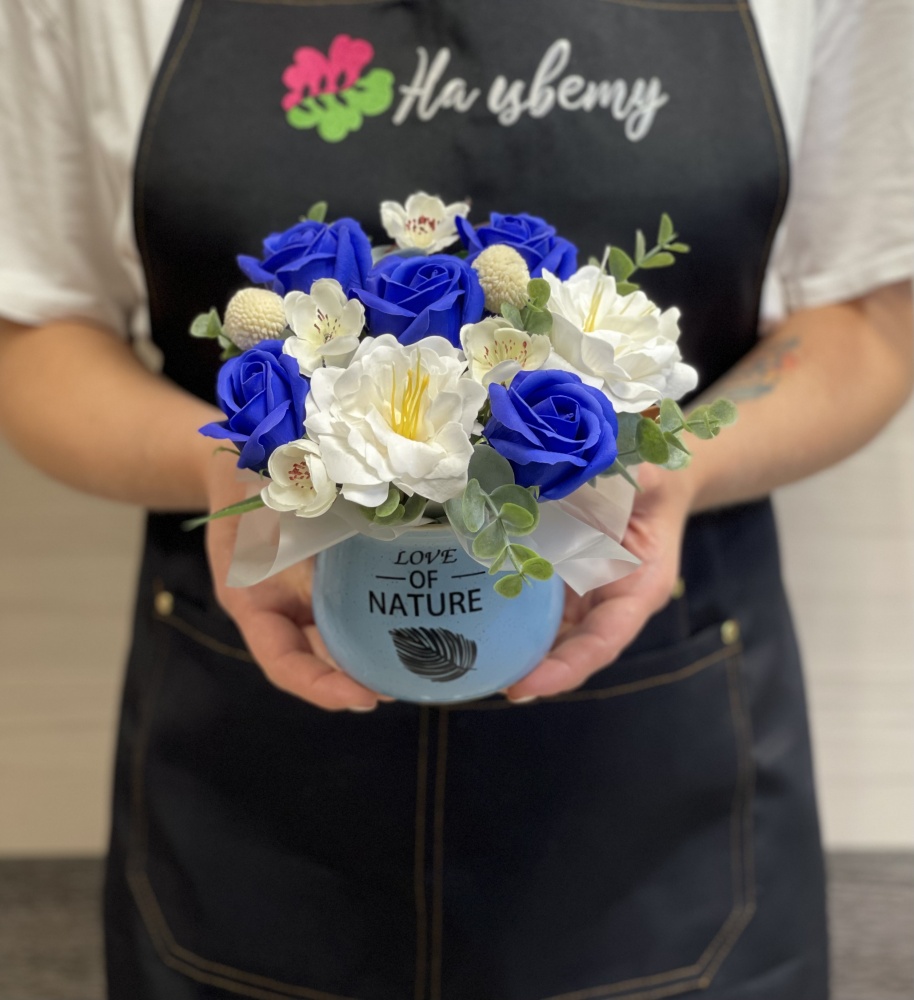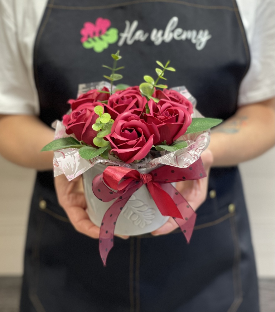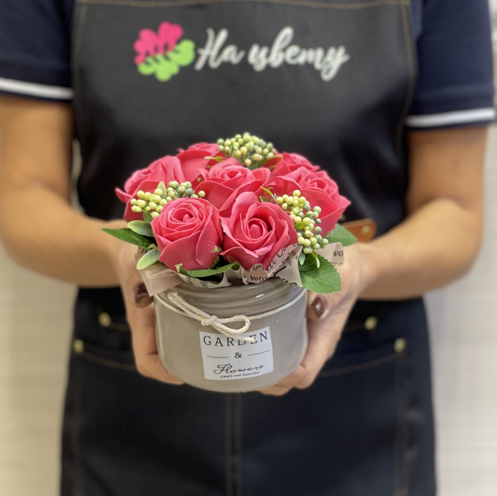 Мыльные розы — 7шт, декоративная зелень, оазис, керамическое кашпо. Размеры композиции: 10см16см