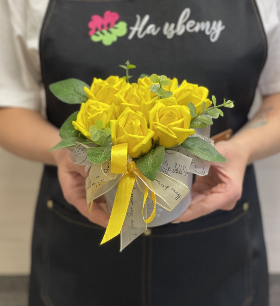 Мыльные розы — 11шт, декоративная зелень, оазис, шляпная коробка, лента. Размеры композиции: 12см22см.