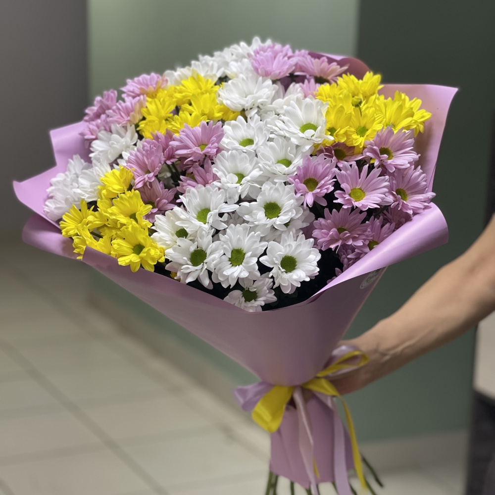 Хризантема кустовая пушистая -9шт, упаковка, лента