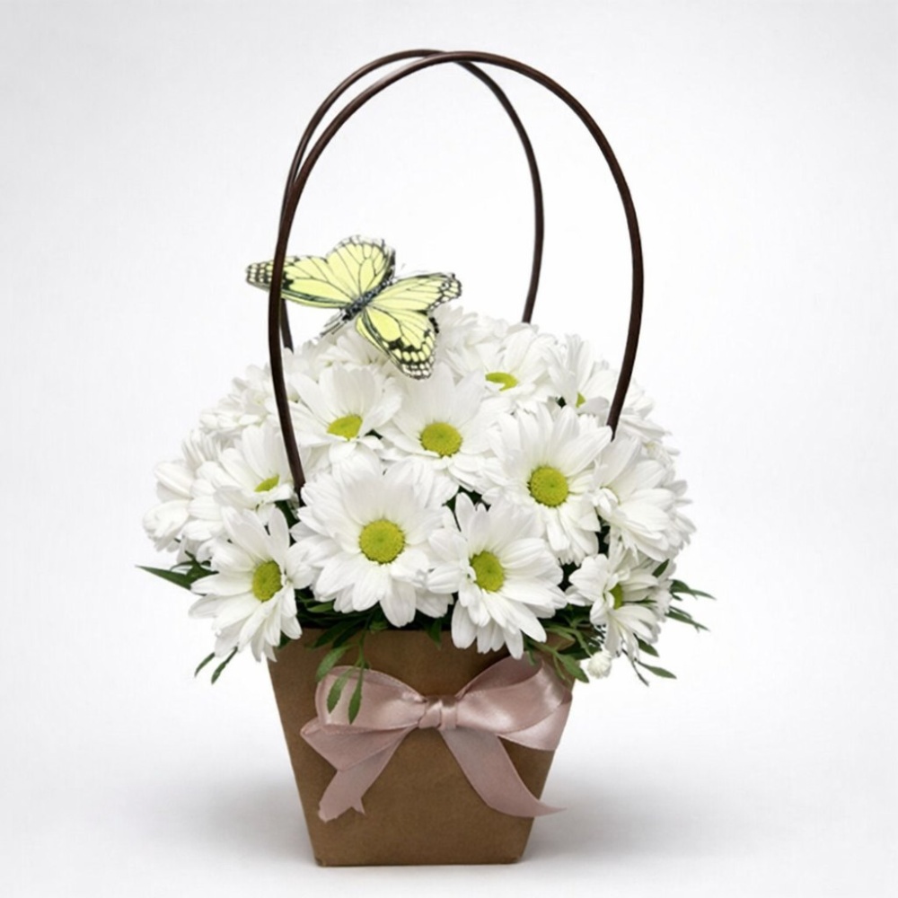 Хризантема кустовая ромашка -3шт, зелень фисташка, оазис, декор бабочка, лента, сумочка крафтовая ~12*12*12см