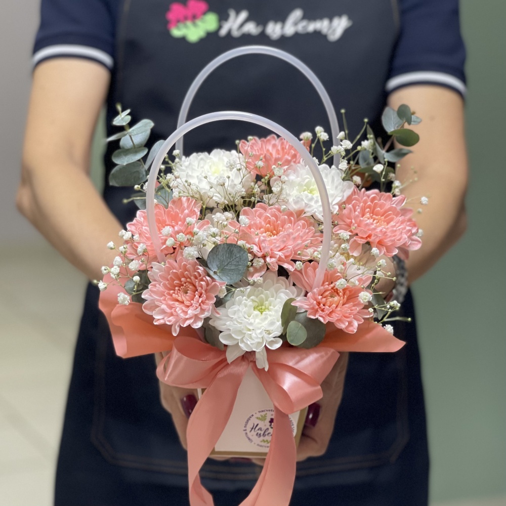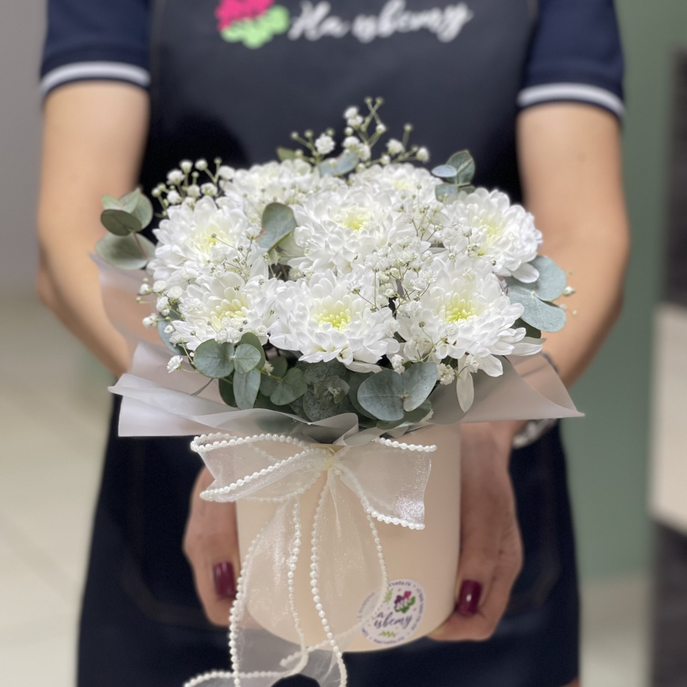 Хризантема кустовая 1-2шт, гипсофила белая, эвкалипт, оазис, пленка, лента, коробочка 12см