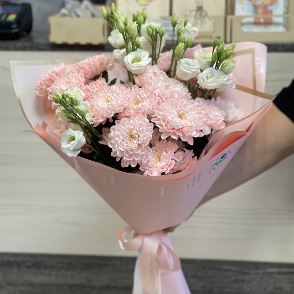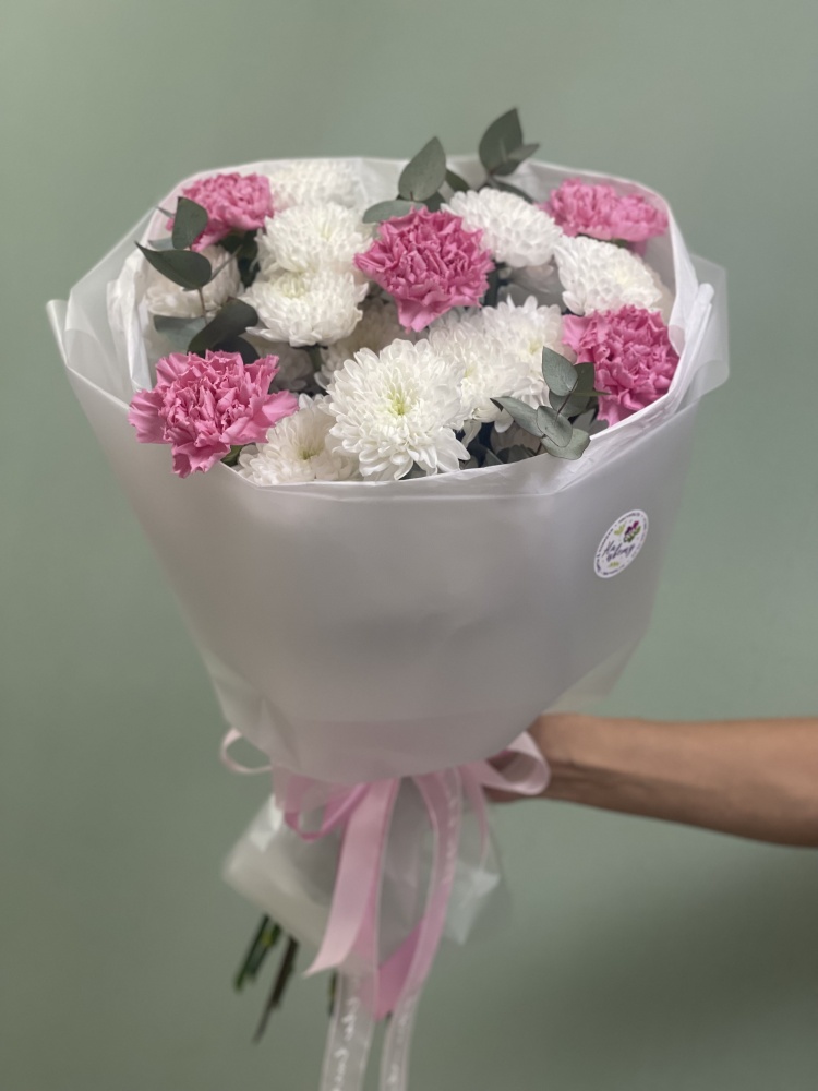 Диантус 5шт., хризантема 3шт, эвкалипт, упаковка, лента