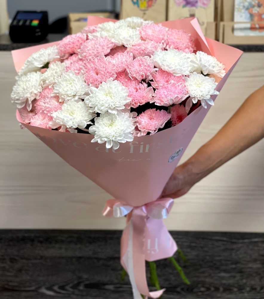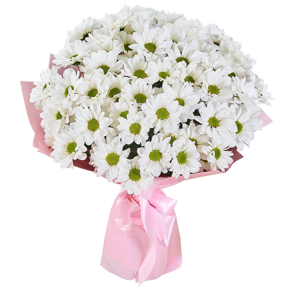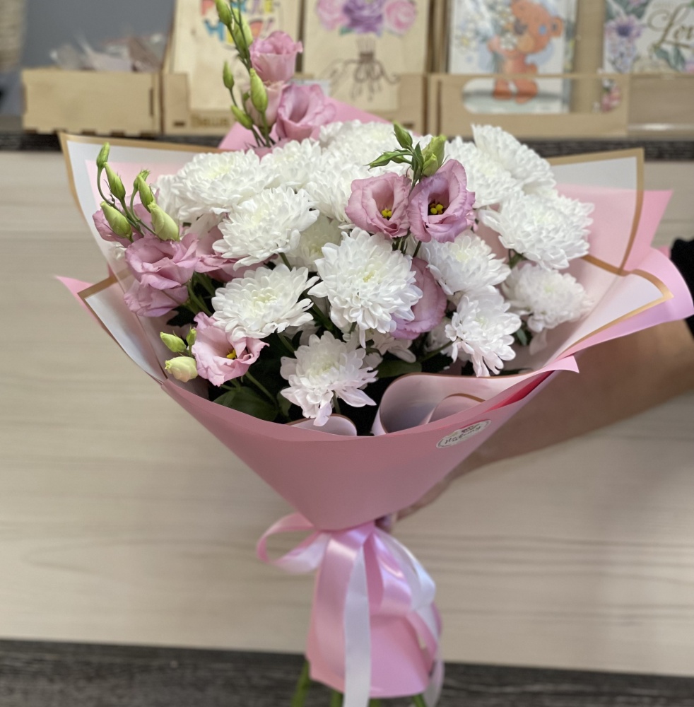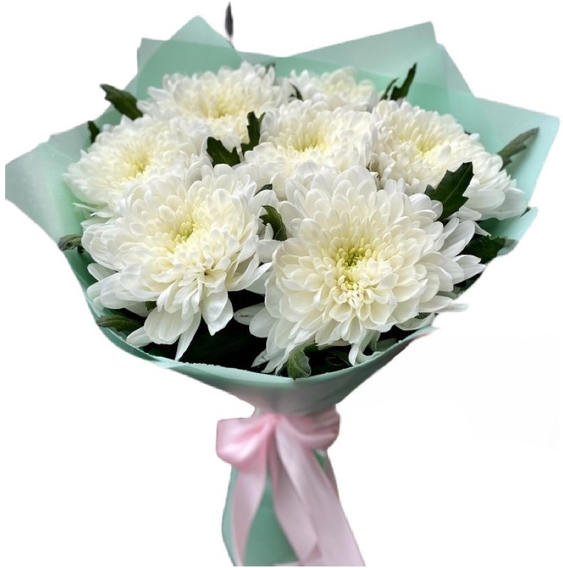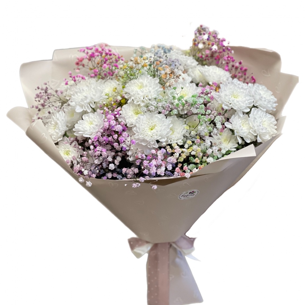 Хризантема кустовая 7шт, гипсофила 4шт, упаковка, лента