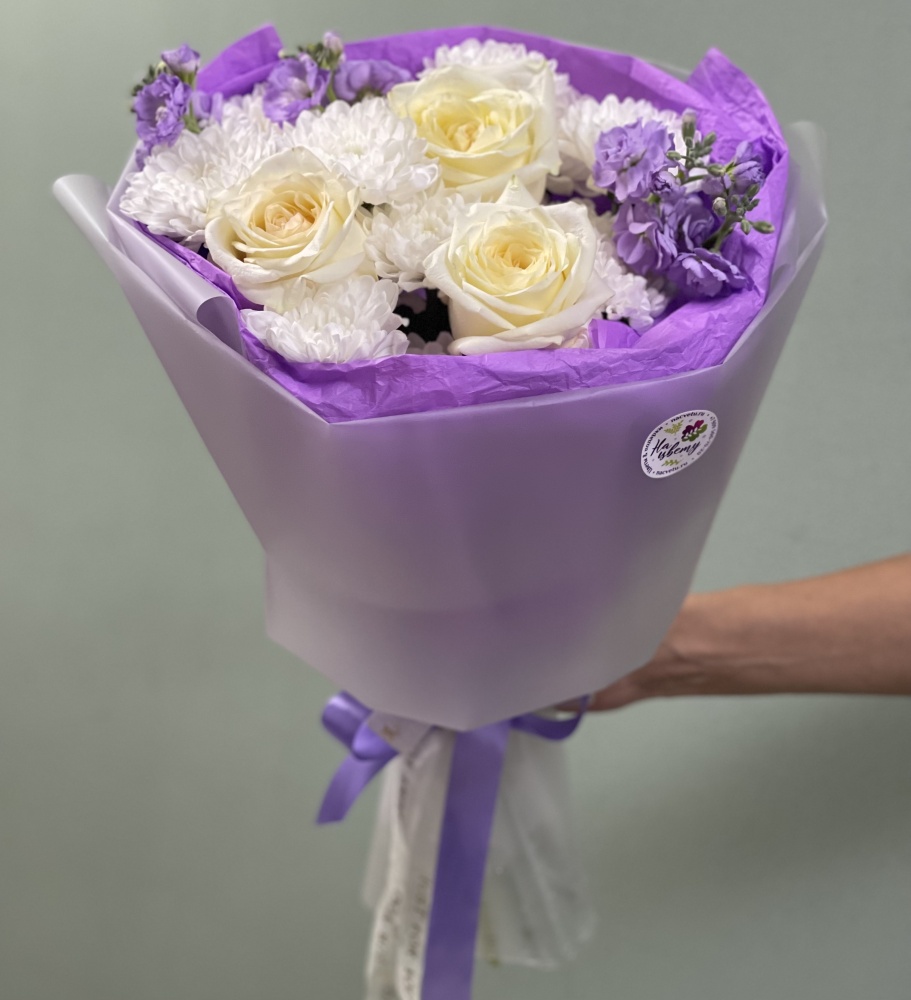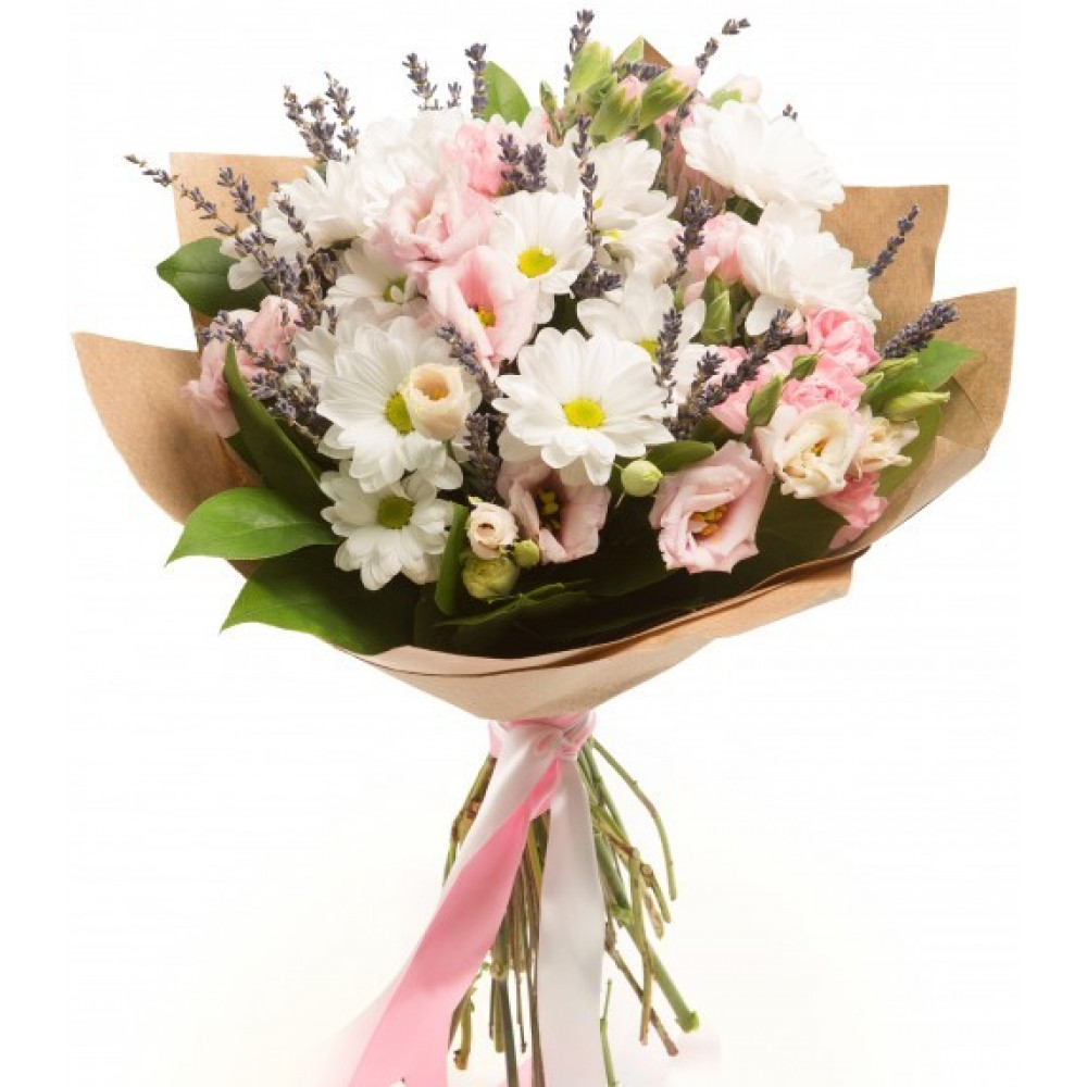 Хризантема кустовая 3шт, эустома 3шт, кустовая гвоздика 1шт, лаванда, рускус 3шт, крафт, лента