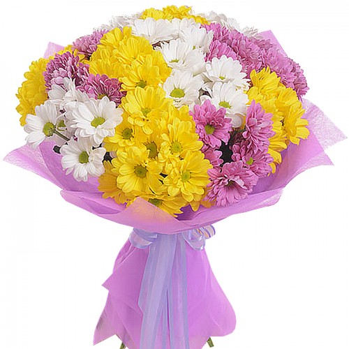 Хризантема кустовая 5шт, альстромерия 4шт, упаковка, лента