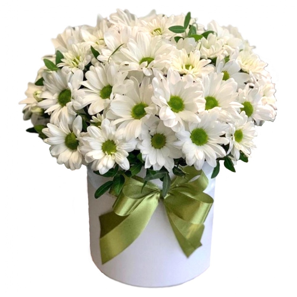 Хризантема кустовая 5шт, фисташка, оазис, коробка шляпная 16-18см