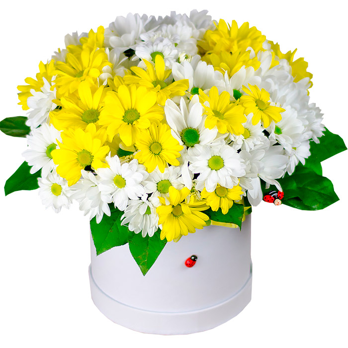 Хризантема кустовая 5шт, салал, декор, оазис, коробка 18см