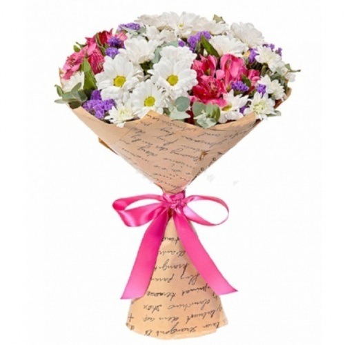 Хризантема кустовая 5шт, альстромерия 3шт, статица 2шт, эвкалипт, крафт, лента