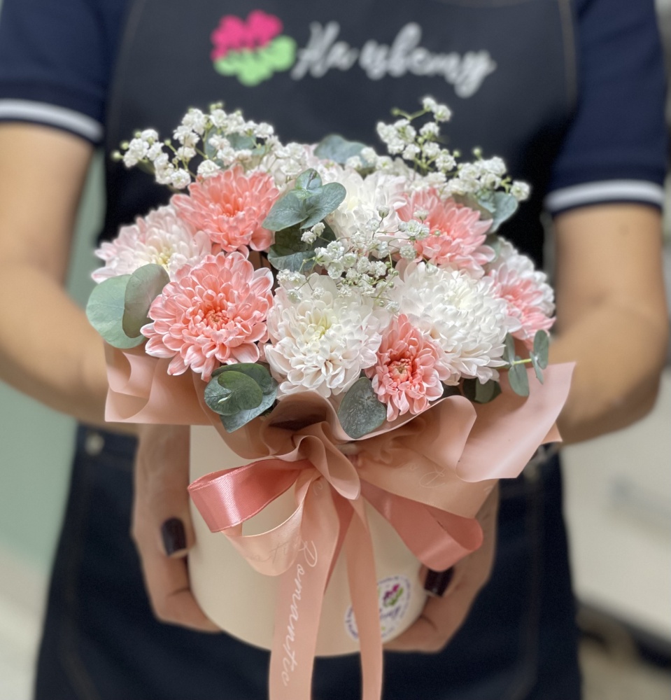 Хризантема кустовая 2шт, гипсофила, эвкалипт, оазис, коробочка 12см, лента