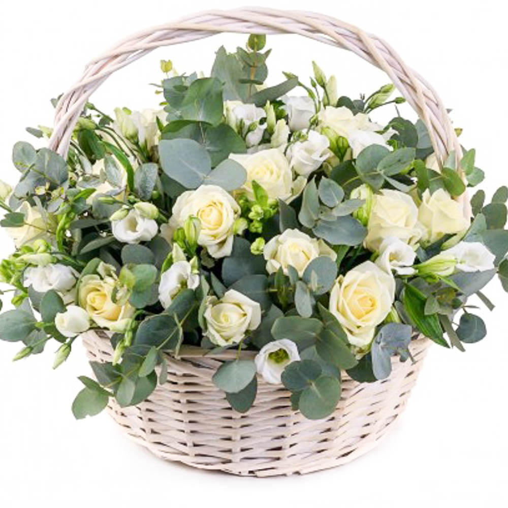 Роза Эквадорская 50см 15шт, эустома 7шт, эвкалипт, корзина ива 36-40см, оазис