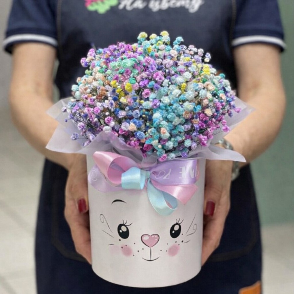 Гипсофила радужная 1-2шт, керамическое кашпо «Котик», оазис, пленка.