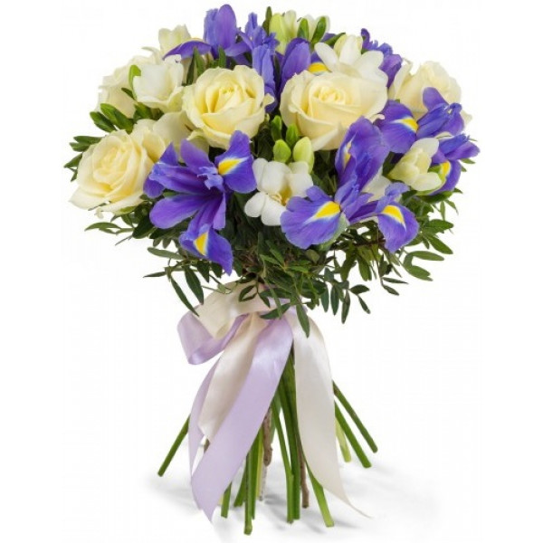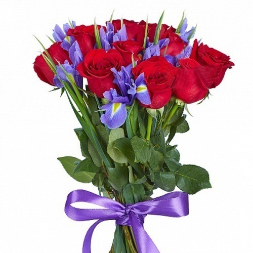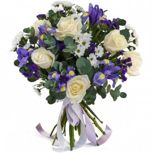 Роза Эквадорская 50см -9шт, хризантема кустовая — 6шт, ирис — 9шт, эвкалипт, лента