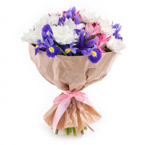 Хризантема кустовая — 2шт, ирис — 5шт, альстромерия — 3шт, крафт, лента