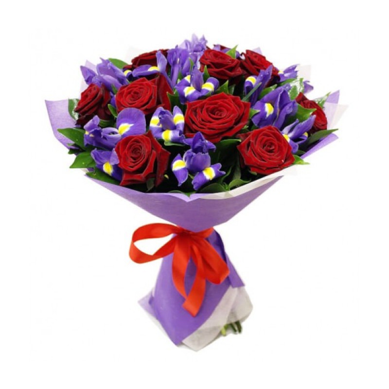 Роза Эквадорская 50см -9шт, хризантема кустовая — 6шт, ирис — 9шт, эвкалипт, лента