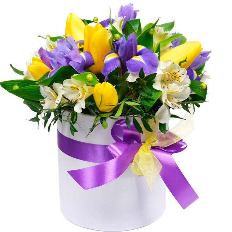 Тюльпаны 5шт, ирисы 4шт, альстромерия 2шт, фисташка, оазис, шляпная коробка 16см, лента