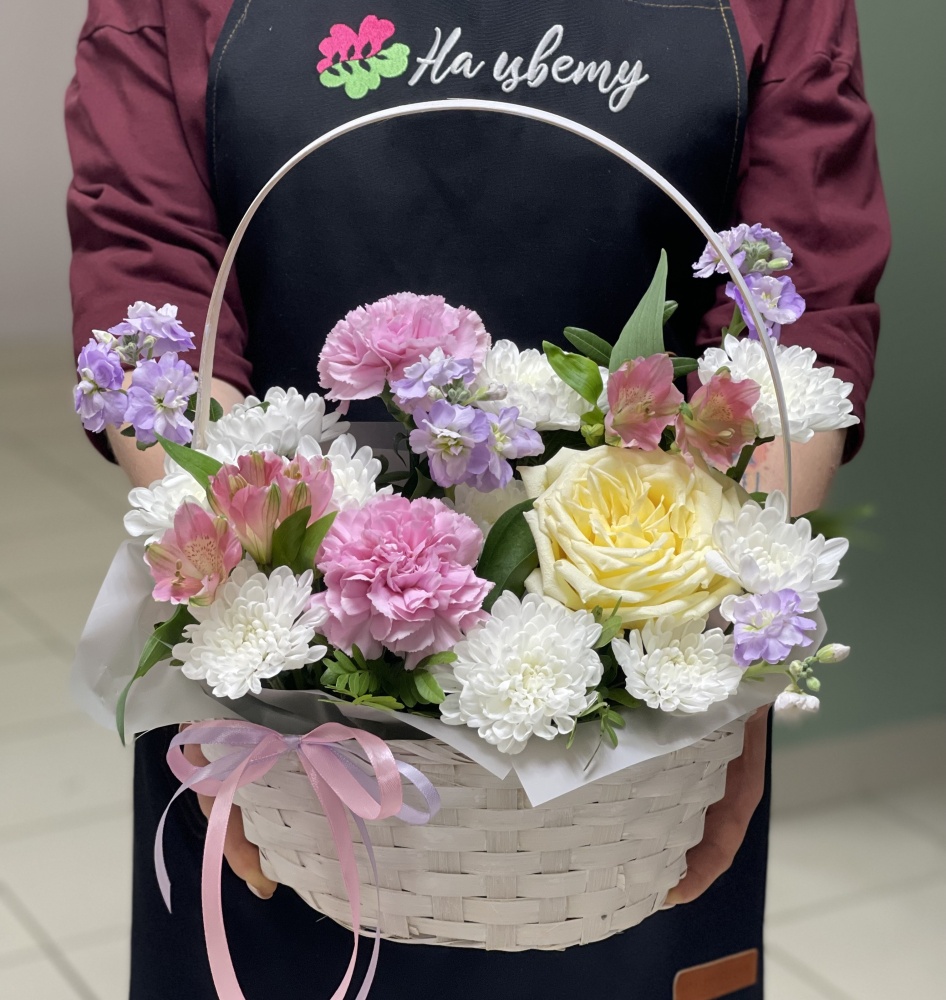Хризантема кустовая пушистая 5шт, роза Эквадорская 50см 3шт, упаковка, лента
