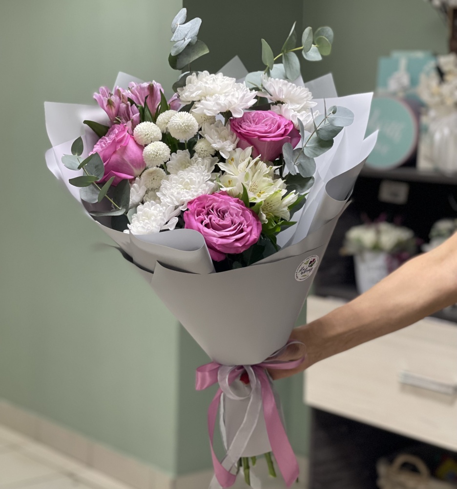 Роза пионовидная — 3 шт, хризантема кустовая 3шт, альстромерия 2шт, эвкалипт, упаковка, лента
