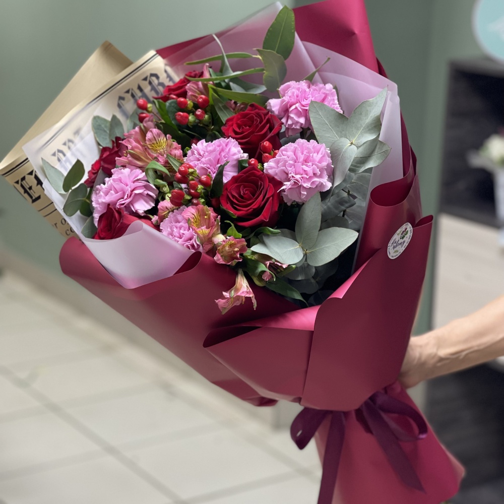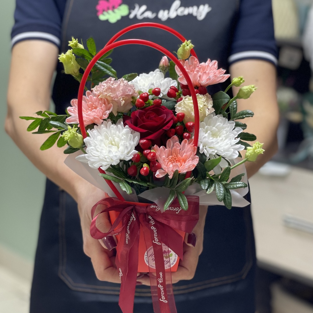 Хризантема кустовая — 1-2шт, конфеты Dove— 7шт, оазис, коробочка 18см, лента, декор, наполнитель бумажный