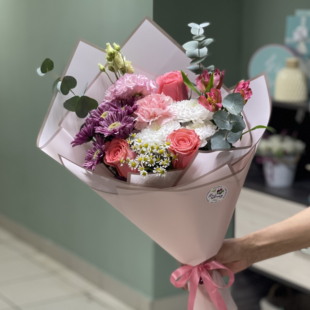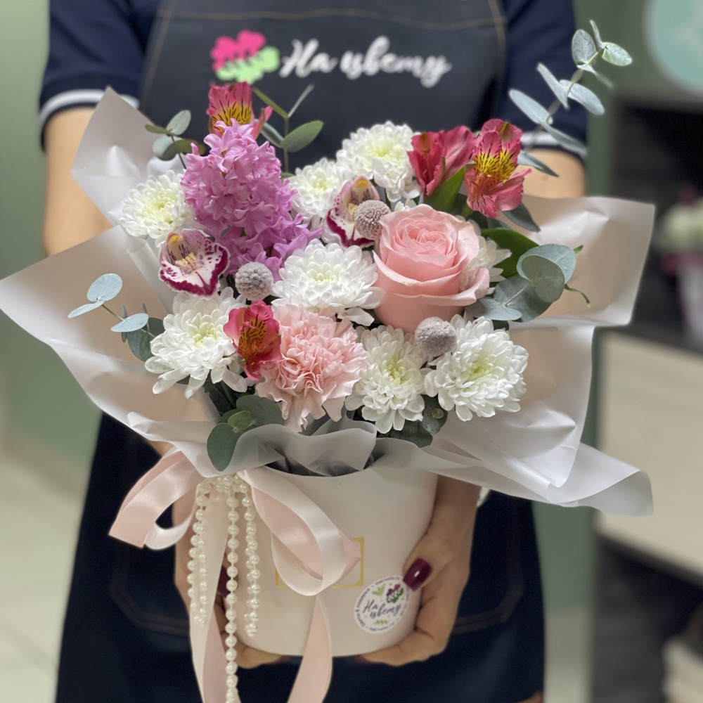 Хризантема кустовая — 1-2шт, конфеты Dove— 7шт, оазис, коробочка 18см, лента, декор, наполнитель бумажный