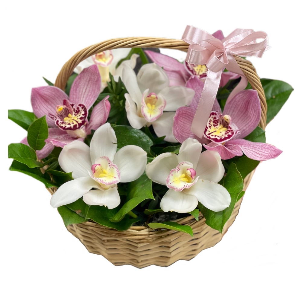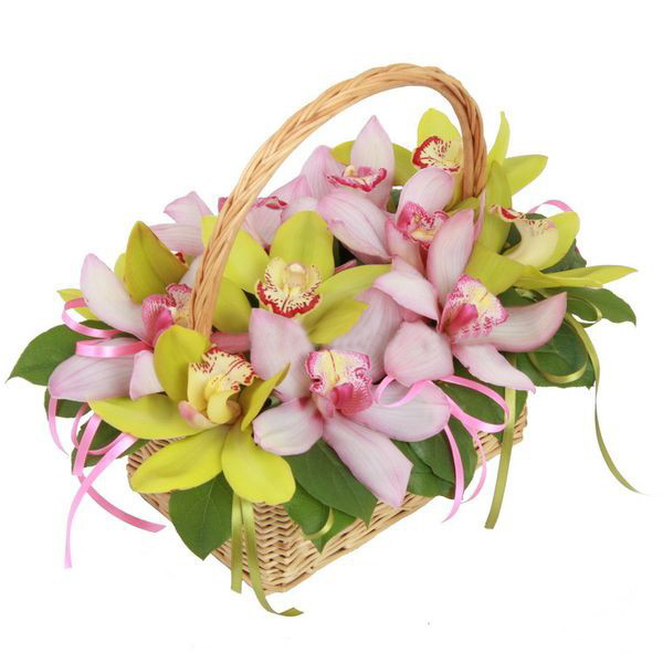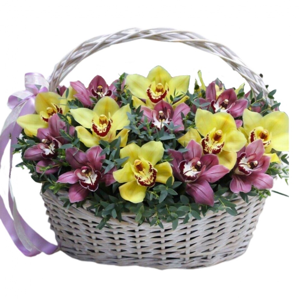 Орхидея цимбидиум — 7шт, салал, оазис, корзина ива, лента