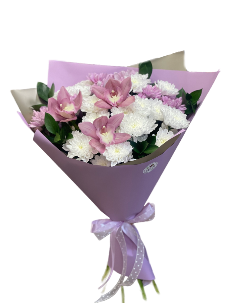 Орхидеи розовые — 3шт, хризантема кустовая — 6 шт, рускус — 5шт, упаковка, лента