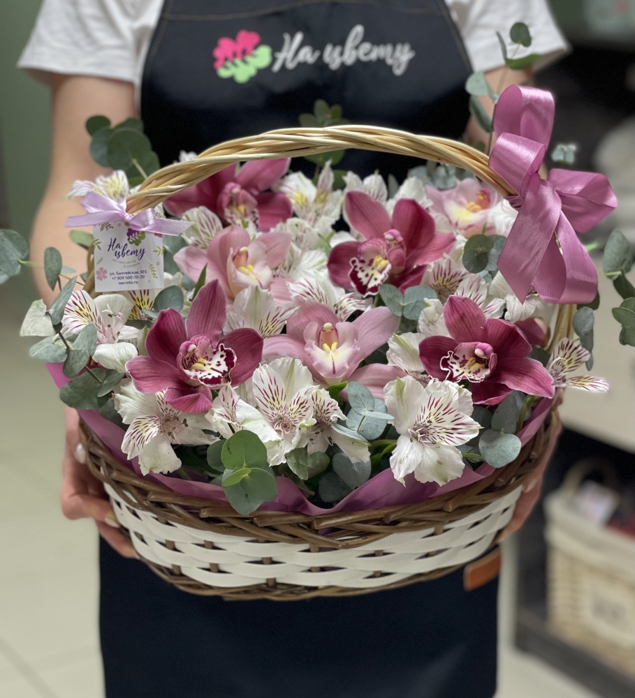 Орхидея цимбидиум — 7шт, альстромерия — 6шт, эвкалипт, корзина ива ~ 35см, оазис, лента