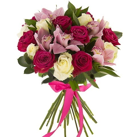 Роза Эквадорская 50 см -15шт, орхидея цимбидиум -5шт, рускус, лента