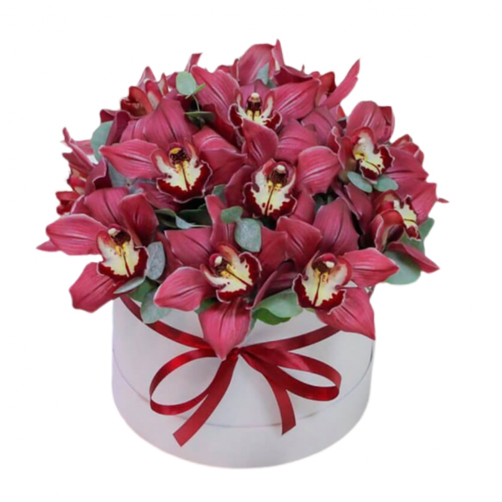 Орхидея цимбидиум 11шт, зелень, оазис, шляпная коробка 20см, лента