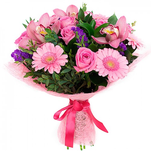 гербера — 3 шт, роза — 5 шт, орхидея — 3 шт, статица, рускус, эвкалипт, сизаль, лента