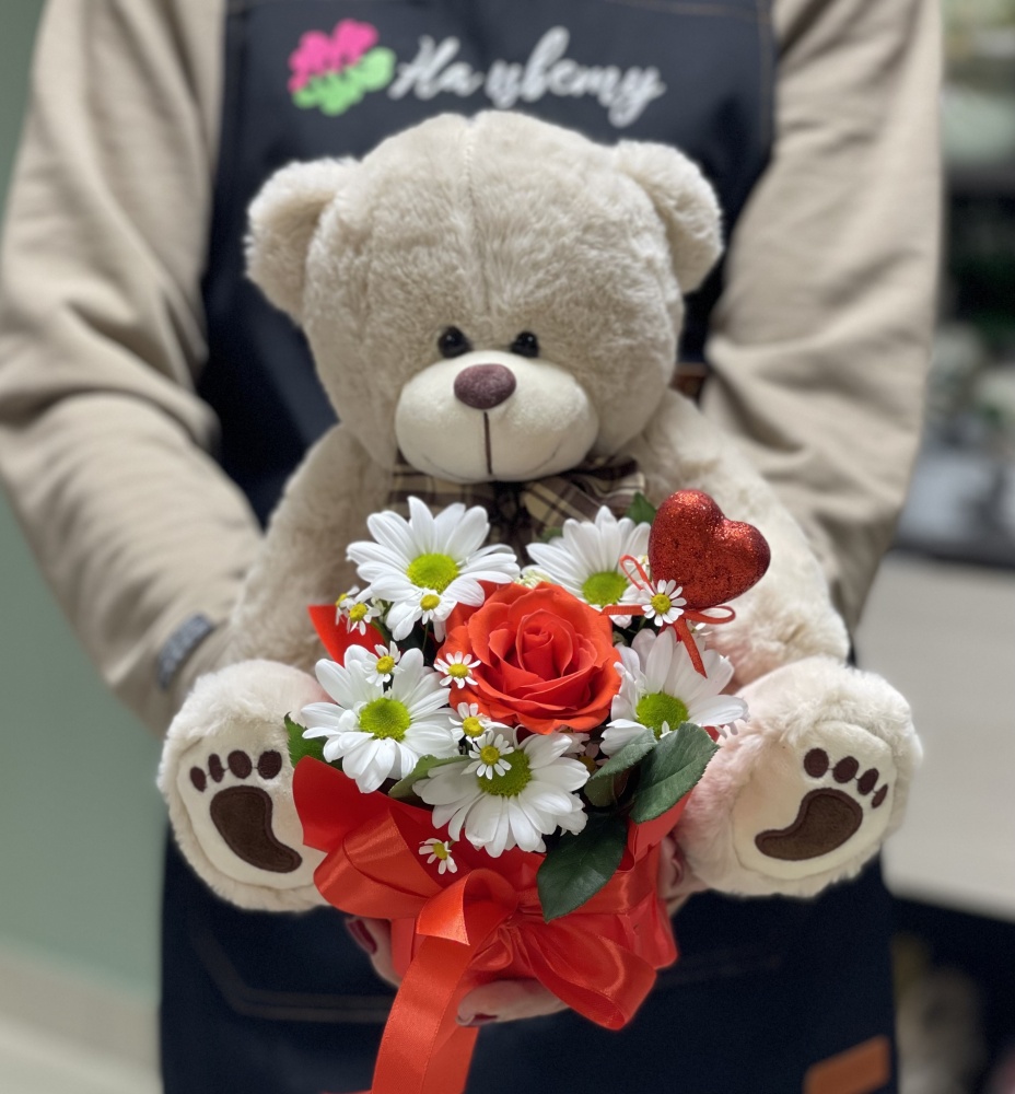 Медведь Снежок 28см, Роза Эквадорская — 1шт, танацетум, хризантема, сердце декор, губка, лента, упаковка