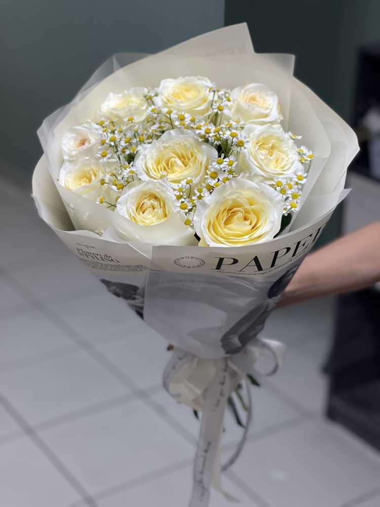Роза Эквадорская 50см — 9шт, хризантема кустовая — 6шт, эвкалипт, крафт, лента
