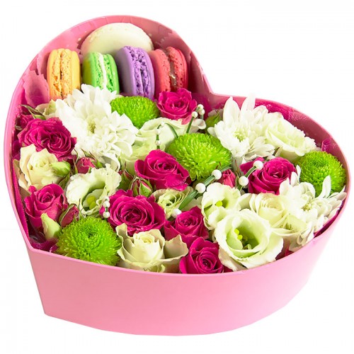 Роза кустовая 2шт, хризантема 2шт, эустома 1шт, берграсс, декор, оазис, коробочка-сердце 22см, макаронсы 5шт, наполнитель бумажный