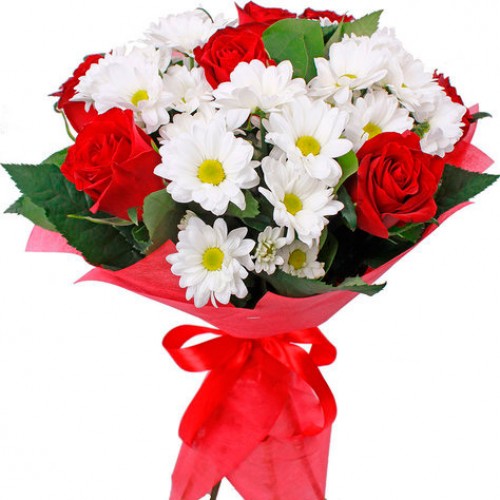 Роза Эквадорская 50см -7шт, хризантема кустовая -4шт, салал, фетр, лента