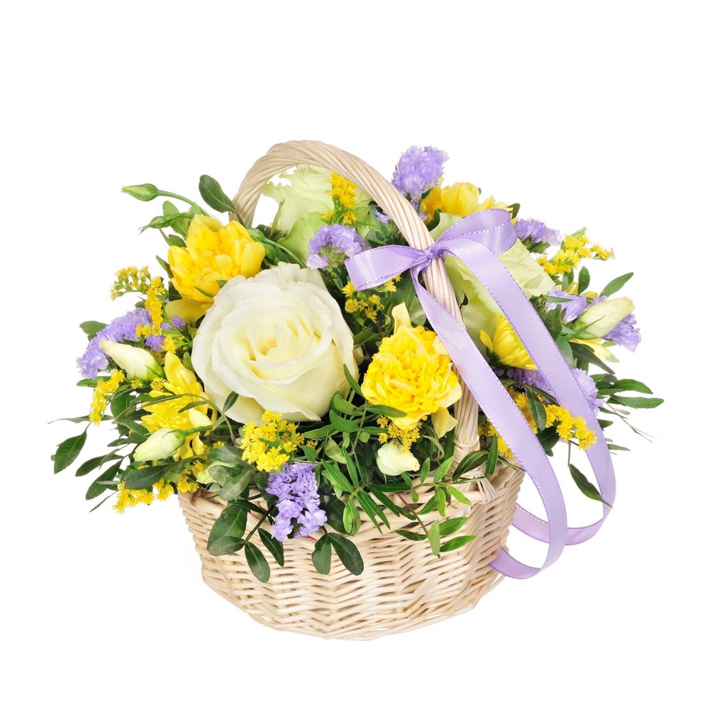 Роза эквадорская 50см 3шт, хризантема кустовая 2шт, эустома 1шт, солидаго (лимониум) 1шт, статица 1шт, фисташка, корзина ива 21-25см, оазис, лента