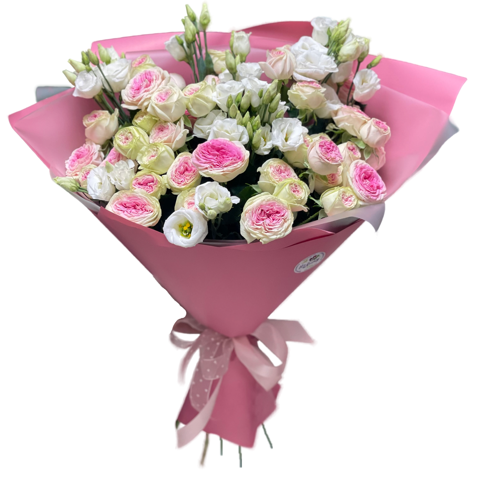 Роза кустовая — 5шт, эустома белая — 4шт, упаковка, лента