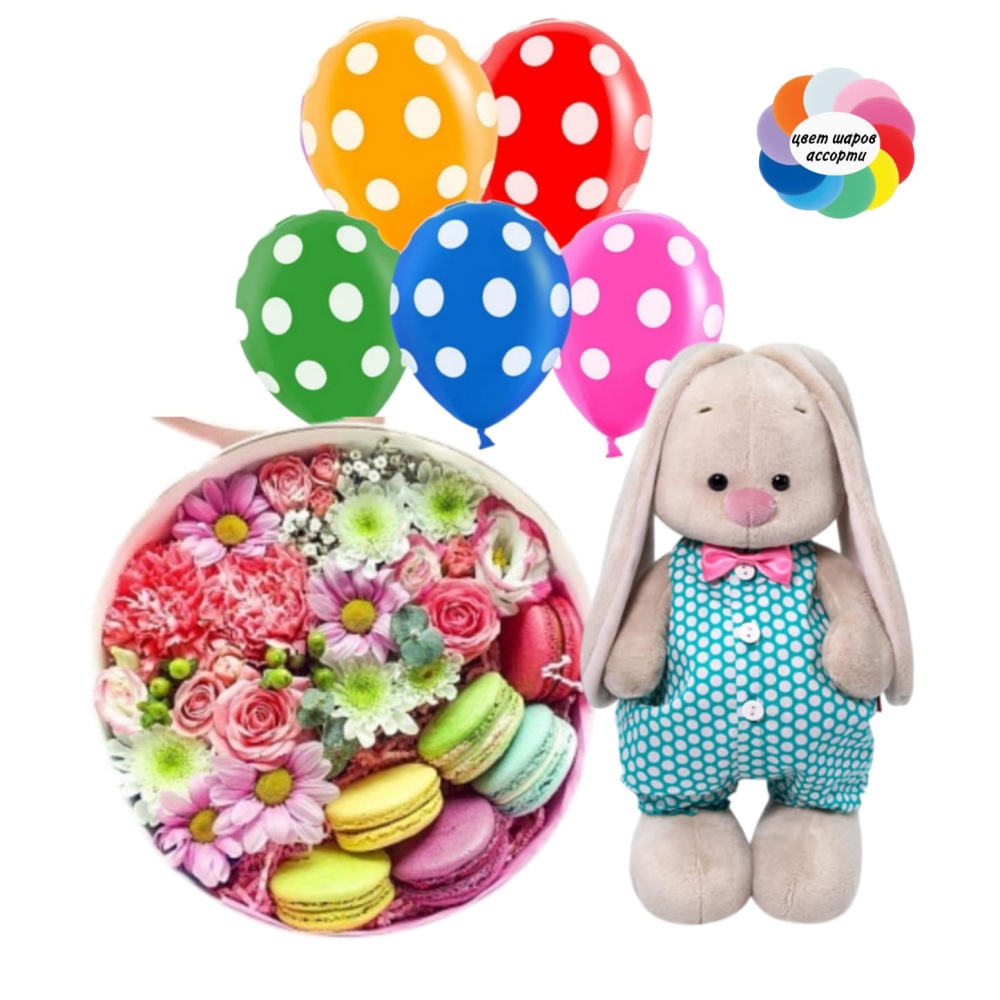 Хризантема кустовая 2шт, роза Кения 3шт, гвоздика одноголовая 2шт, гиперикум, гипсофила, эустома, зелень, оазис, коробка круглая 20-22см, печенье макаронс 6шт, наполнитель ,Зайка Ми в изумрудном комбинезоне 25см, гелиевые воздушные шары — 5шт