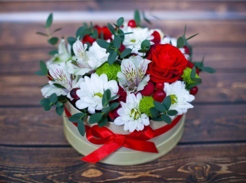 Роза Эквадорская 50см 3шт, хризантема кустовая 2шт, гиперикум 2шт, зелень, оазис, коробка, лента. Размер композиции: 25х20х15см