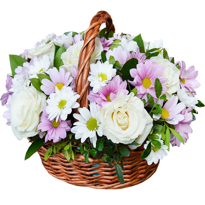 Хризантема кустовая — 4шт, Эквадорская роза 50см — 5шт, зелень, оазис, корзина 25-30см