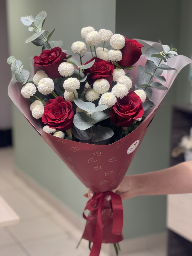 Роза Эквадорская 50см 7шт, хризантема кустовая 5шт, гипсофила 1шт, гиперикум 2шт, аспидистра 5шт, упаковка, лента