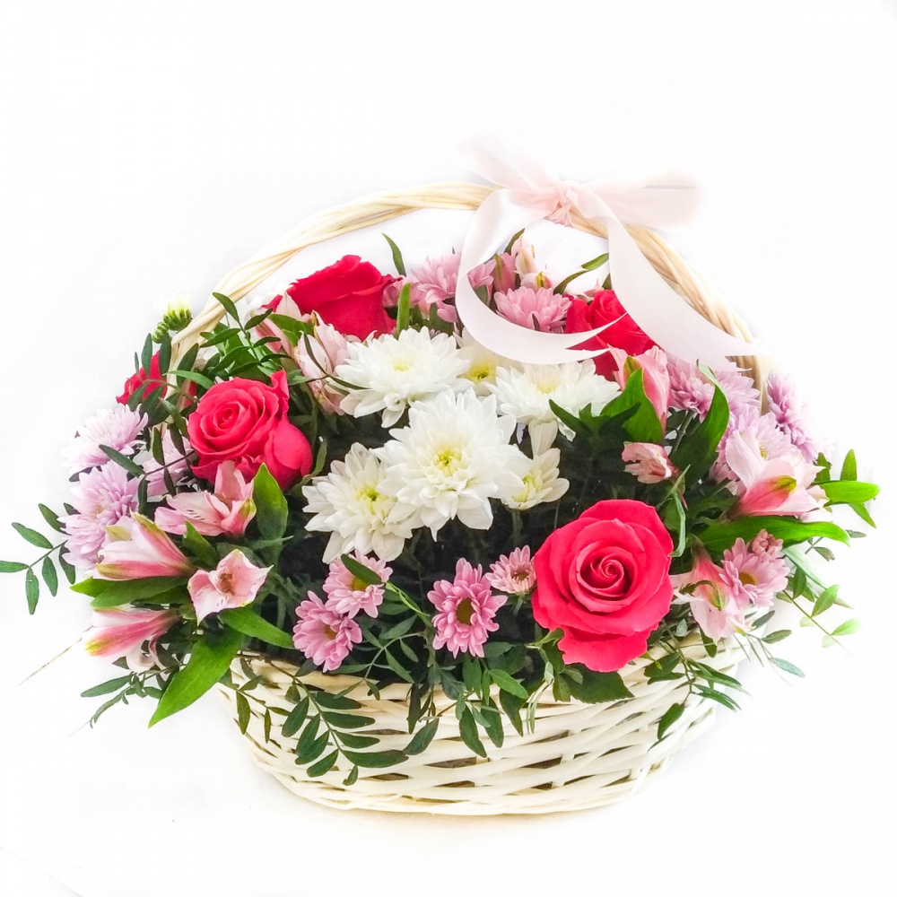 Роза Эквадор 50см 5шт, хризантема кустовая 5шт, альстромерия 3шт, писташь, оазис, лента, корзина круглая 31-33см.